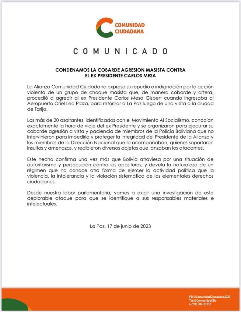 Un comunicado oficial de Comunidad Ciudadana, expresa su «repudio e indignación» por el ataque a su máximo líder, y denuncia que «los más de 20 asaltantes identificados con el MAS, conocían exactamente la hora de viaje del ex Presidente y se organizaron para ejecutar su cobarde agresión a vista y paciencia de miembros de la Policía Boliviana que no intervinieron para impedirla.»