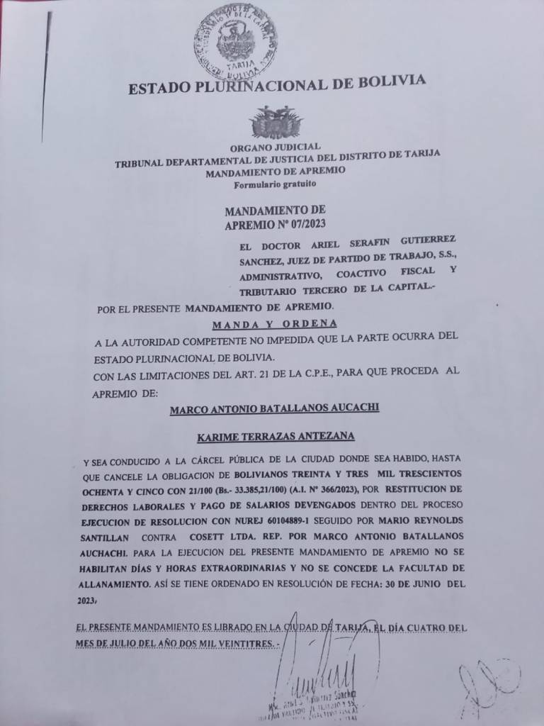 El consejero de la Cooperativa de Servicios Telefónicos de Tarija (COSETT), Eduardo Casazola Borda, informó que el Órgano Judicial emitió un Mandamiento de Apremio contra dos consejeros administrativos, conminados a cancelar 33.385 Bs. como restitución de derechos laborales y pago de salarios devengados, a favor de Mario Reynolds Santillán.
