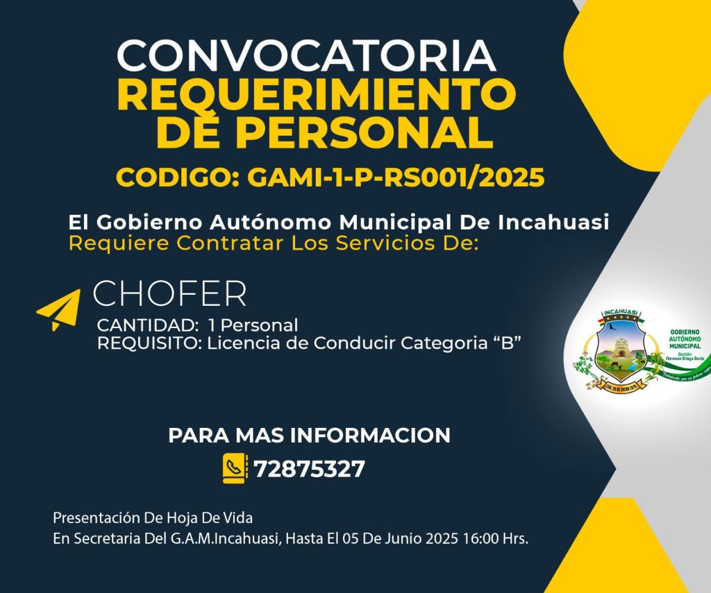 8. El Gobierno Autónomo Municipal de Incahuasi requiere contratar un Chofer con Licencia de Conducir Categoría B. Código de la Convocatoria: GAMI-1-P-RS001/2025 Plazo de postulación hasta el 5 de junio. Interesados presentar su Hoja de Vida en Secretaría del G.A.M.I. o pedir información al 72875327