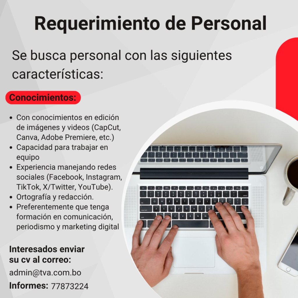 7. Televisión Andalucía requiere contratar un Comunicador o Periodista para trabajo digital. Interesados enviar su Curriculum Vitae al correo electrónico: admin@tva.com.bo o comunicarse al 77873224