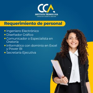 3. Instituto Técnico CCA requiere Ingeniero Eléctrico, Diseñador Gráfico, Comunicador o Especialista en Oratoria, Informático con dominio en Excel y Power BI, y Secretaria Ejecutiva. Interesados enviar su Hoja de Vida al correo electrónico cca.tarija@cca.edu.bo