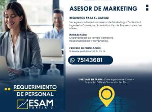 7. ESAM requiere Asesor de Marketing para el área de Educación. Requisitos: Ser Egresado o Titulado de Ingeniería Comercial o ramas afines, conocimiento avanzado de marketing digital (con inteligencia artificial deseable). Interesados comunicarse al 75143681 y presentar su documentación en Calle Ingavi entre Colón y Suipacha, Edificio Coronado, 1er. Piso.