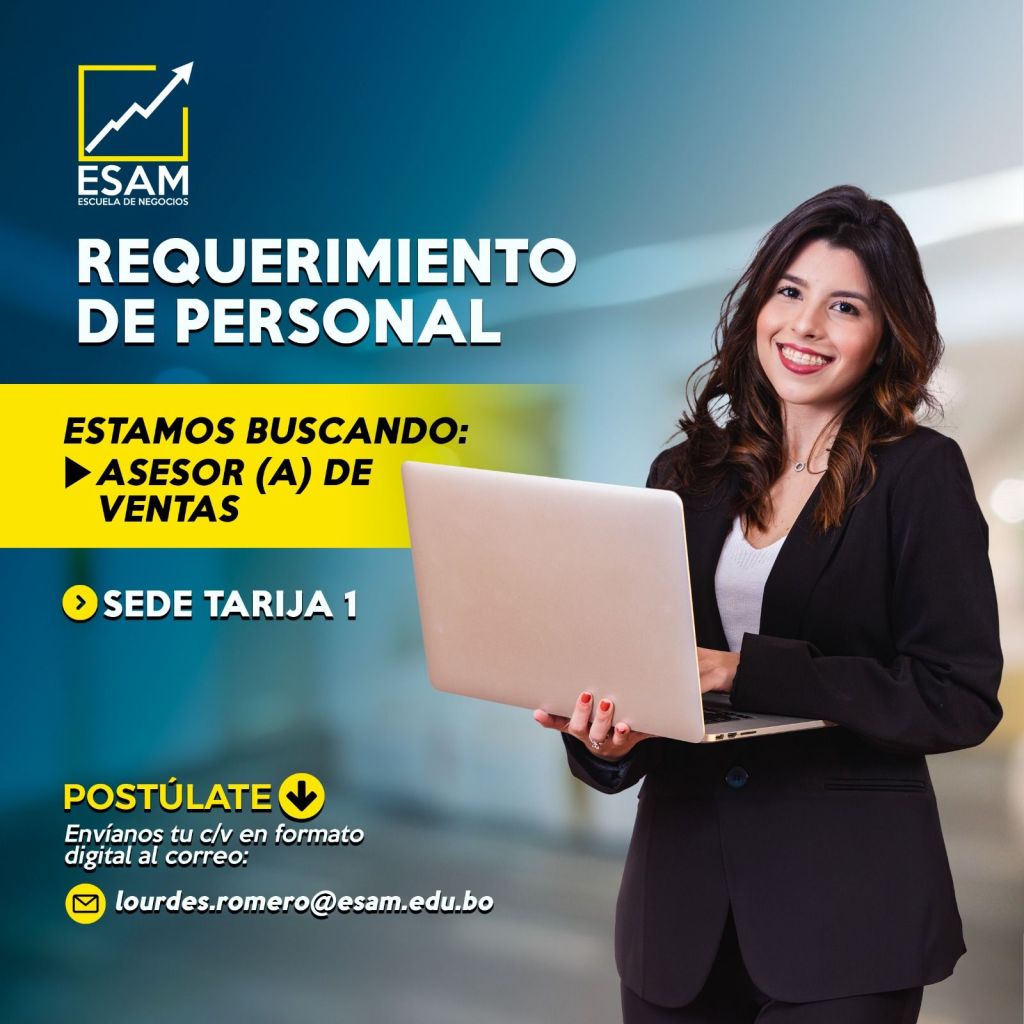 9. ESAM requiere Asesor/a de Ventas, egresado de Ingeniería Comercial, Administración de Empresas, Marketing, Comunicación Social o ramas afines. Interesados enviar Curriculum Vitae actualizado hasta el 24 de Agosto, al correo electrónico lourdes.romero@esam.edu.bo o comunicarse al 71861990