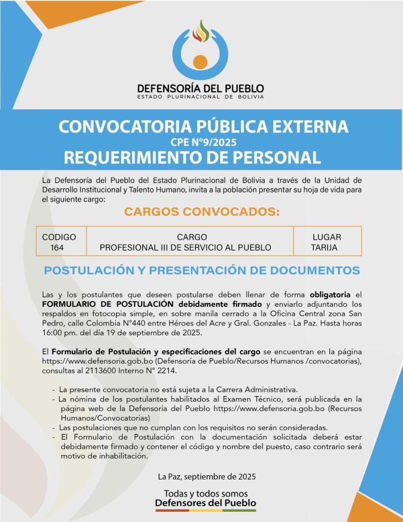 8. DEFENSORÍA DEL PUEBLO requiere Profesional III de Servicio al Pueblo en Tarija. Fecha de postulación hasta el 19 de septiembre a las 16:00 hrs. Interesados llegar el Formulario de postulación o comunicarse al 2113600 Interno N° 2214.