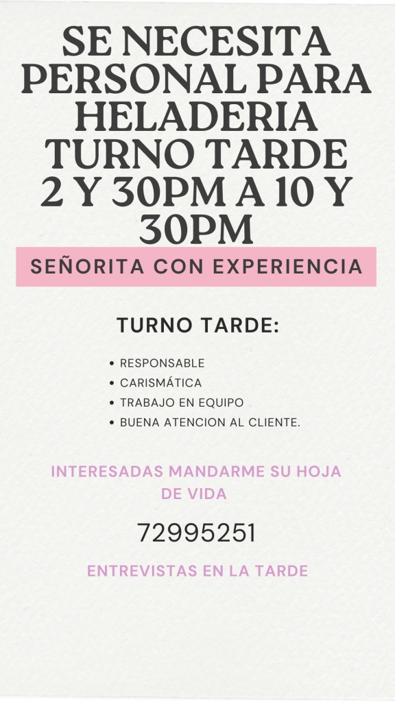 17. AMBRA ICE CREAM requiere Señorita con experiencia para Heladería, en el turno tarde. Interesadas comunicarse y enviar su Hoja de Vida al 72995251 para entrevistas en la tarde.