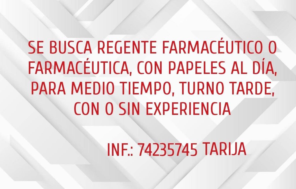 3. FARMACIA SANTI requiere un Regente Farmacéutico con papeles al día, para medio tiempo, turno tarde, con o sin experiencia. Interesados comunicarse al 74235745