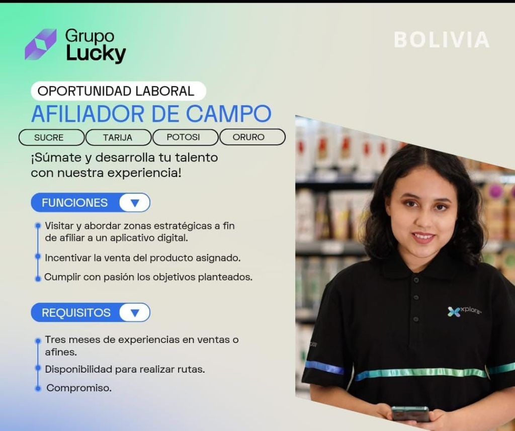 26. GRUPO LUCKY requiere Afiliador de Campo mediante un Aplicativo Digital. Los interesados deben acudir al Barrio La Loma, Multiplaza Oficina #35, de 8:00 am. a 9:00 am. o comunicarse con John al 71341141