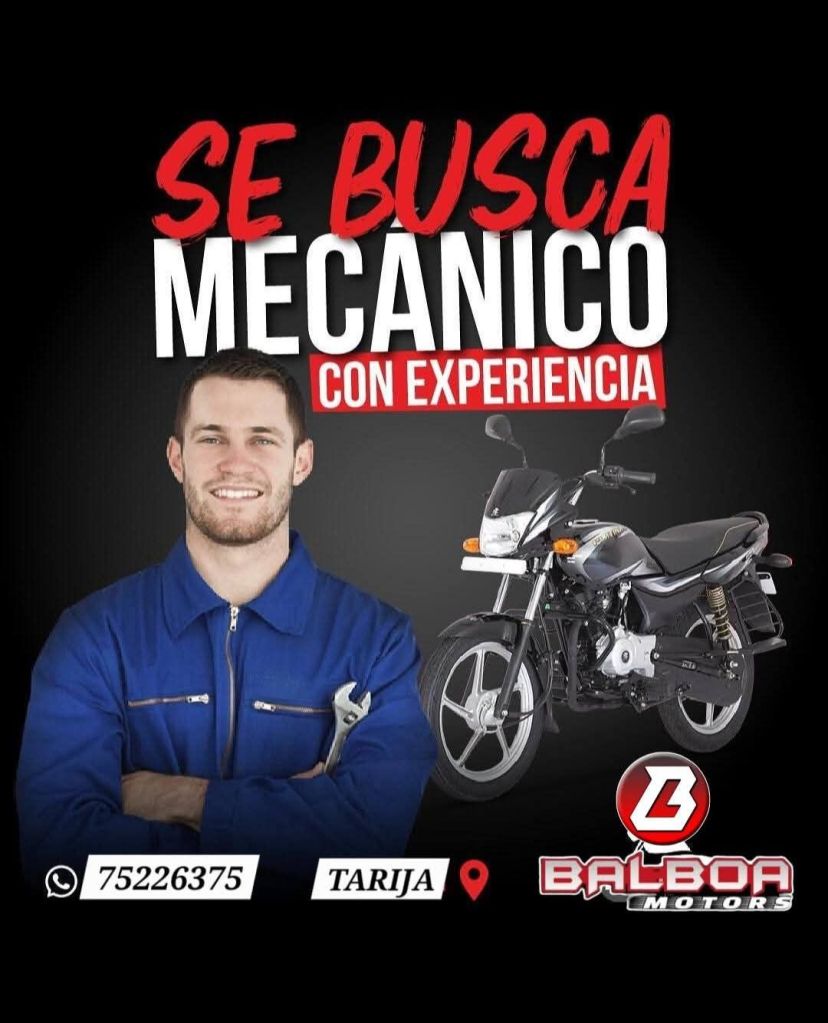 19. MOTOS BALBOA requiere un Mecánico. Interesados comunicarse al 75226375 o dirigirse a la Avenida Circunvalación, entre Méndez y Suipacha.