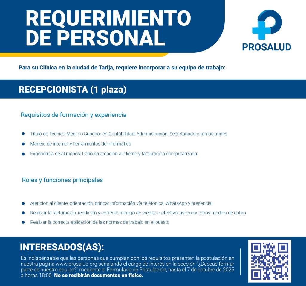 4. PROSALUD requiere Recepcionista con Título de Técnico Medio en Contabilidad, Administración, Secretariado o ramas afines, con experiencia mínima de un año en Atención al Cliente y facturacion computarizada. Plazo de postulación hasta el 7 de octubre, a las 18:00 pm. Interesados postular en el siguiente enlace: https://docs.google.com/forms/d/e/1FAIpQLSfecKBjetauYa-TfdbOl11W-nZHKIhQlercWC4cOl0Te22rcQ/viewform?pli=1