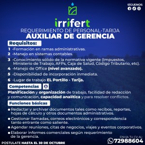 9. IRRIFERT BOLIVIA requiere un Auxiliar de Gerencia, con formación en áreas administrativas, dominio avanzado de Office y ganas de crecer. Plazo de postulación hasta el 30 de octubre. Interesados enviar su Hoja de Vida al 72988604