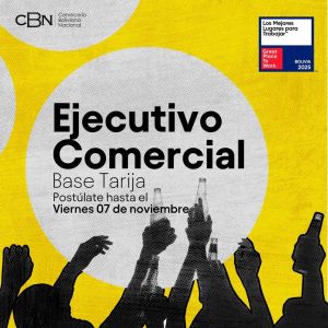 12. CBN - Cervecería Boliviana Nacional requiere un Ejecutivo Comercial para Tarija. Plazo de postulación hasta el viernes 07 de noviembre. Interesados postular en el siguiente enlace: https://wd1.myworkdaysite.com/es/recruiting/abinbev/BOL/job/Tarija/Ejecutivo-Comercial-Tarija_30089752