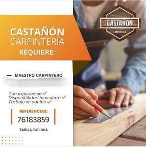 17. Castañón Carpintería requiere Maestros Carpinteros con experiencia y disponibilidadinmediata. Interesados comunicarse al 76183859