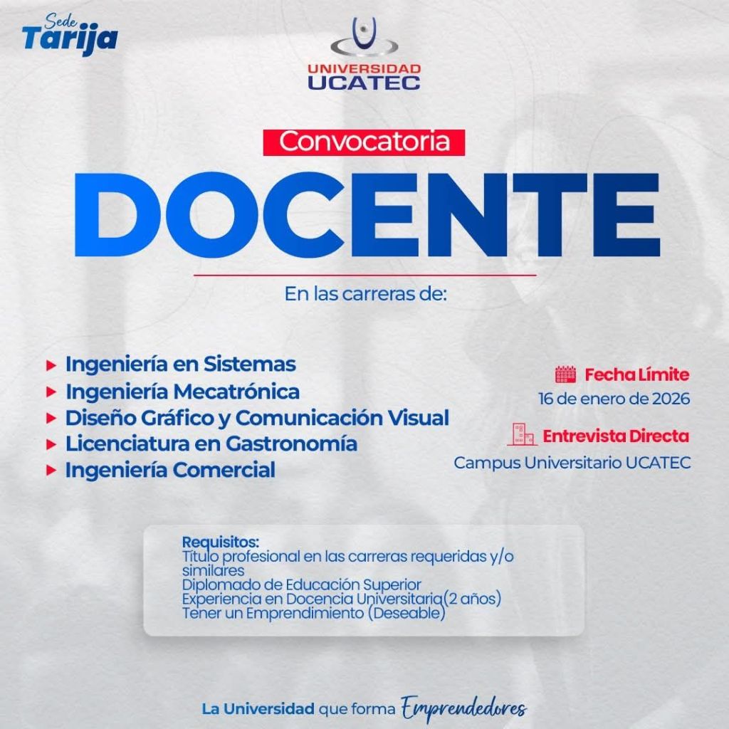 3. UCATEC – Sede Tarija requiere docentes comprometidos, innovadores y con visión profesional. Interesados dirigirse al Campus UCATEC Tarija en Av. Las Américas esq. Juan Misael Saracho o comunicarse al 75115971