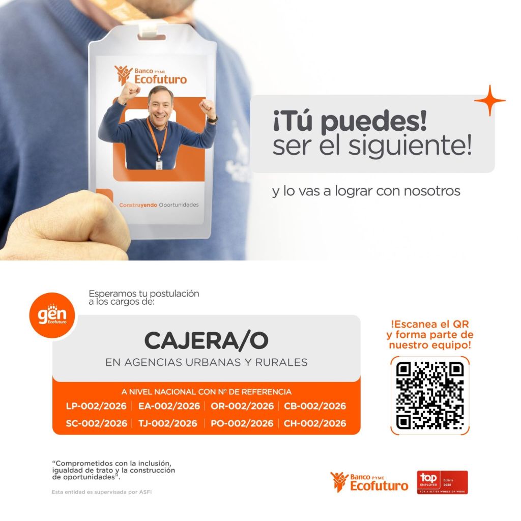4. BANCO ECOFUTURO requiere Cajeros. Plazo de postulación hasta el 11 de enero. Interesados postular mediante el código QR del gráfico 👇