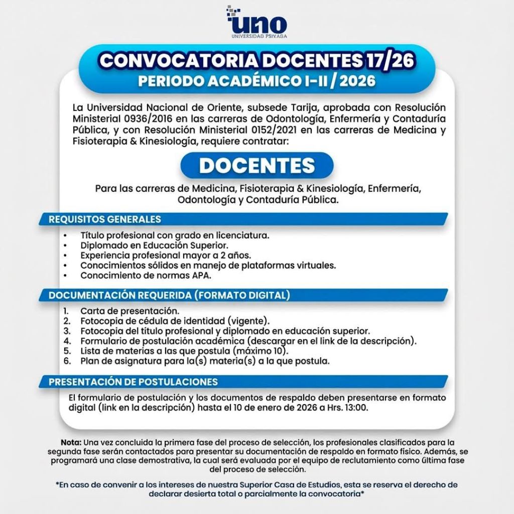 5. Universidad UNO requiere docentes para las Carreras de Medicina, Fisioterapia & Kinesiología, Enfermería, Odontología y Contaduría Pública. Plazo de postulación hasta el 10 de enero.