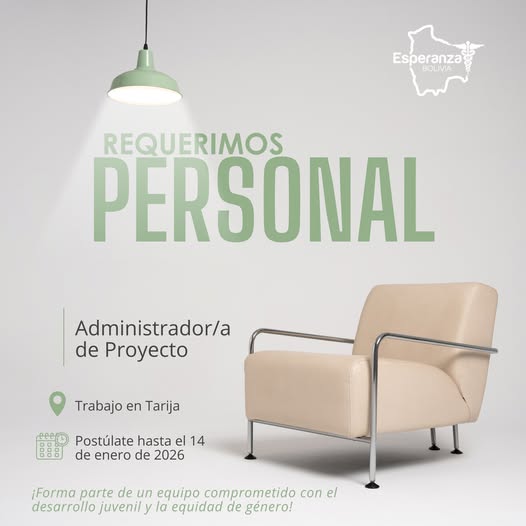 5. 𝗢𝗿𝗴𝗮𝗻𝗶𝘇𝗮𝗰𝗶𝗼́𝗻 𝗘𝘀𝗽𝗲𝗿𝗮𝗻𝘇𝗮 𝗕𝗼𝗹𝗶𝘃𝗶𝗮, en el marco del proyecto ❞𝐃𝐞𝐬𝐚𝐫𝐫𝐨𝐥𝐥𝐨 𝐄𝐜𝐨𝐧𝐨́𝐦𝐢𝐜𝐨 𝐋𝐨𝐜𝐚𝐥 𝐒𝐨𝐬𝐭𝐞𝐧𝐢𝐛𝐥𝐞 𝐜𝐨𝐧 𝐏𝐫𝐨𝐭𝐚𝐠𝐨𝐧𝐢𝐬𝐦𝐨 𝐉𝐮𝐯𝐞𝐧𝐢𝐥 𝐲 𝐄𝐪𝐮𝐢𝐝𝐚𝐝 𝐝𝐞 𝐆𝐞́𝐧𝐞𝐫𝐨 — 𝐕𝐚𝐥𝐥𝐞 𝐂𝐞𝐧𝐭𝐫𝐚𝐥 𝐝𝐞 𝐓𝐚𝐫𝐢𝐣𝐚❞, financiado por la 𝐔𝐧𝐢𝐨́𝐧 𝐄𝐮𝐫𝐨𝐩𝐞𝐚 en Bolivia, requiere contratar: 𝐀𝐝𝐦𝐢𝐧𝐢𝐬𝐭𝐫𝐚𝐝𝐨𝐫/𝐚 𝐝𝐞 𝐏𝐫𝐨𝐲𝐞𝐜𝐭𝐨. Sede en Tarija y con desplazamiento a Padcaya, Uriondo, San Lorenzo y Cercado. Plazo de postulación hasta el 𝟏𝟒 𝐝𝐞 𝐞𝐧𝐞𝐫𝐨 𝐝𝐞 𝟐𝟎𝟐𝟔. Interesados enviar postulación en un solo archivo PDF al correo electrónico: esperanzabolivia@esperanzabolivia.org con el Asunto: Administrador/a de Proyecto. 𝐏𝐞𝐫𝐟𝐢𝐥 𝐲 𝐫𝐞𝐪𝐮𝐢𝐬𝐢𝐭𝐨𝐬 en el siguiente enlace 👉 https://bit.ly/4prWAop