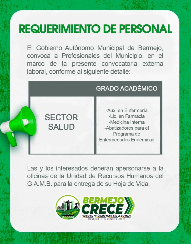10. El Gobierno Autónomo Municipal de Bermejo informa a la población que requiere personal para cubrir distintos cargos, conforme a los perfiles y requisitos establecidos. Los interesados deberán presentar su Currículum Vitae y documentación correspondiente en las oficinas del Gobierno Municipal, dentro de los plazos que serán oportunamente comunicados. Invitamos a las personas que cumplan con los requisitos, a postular.