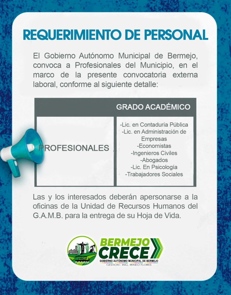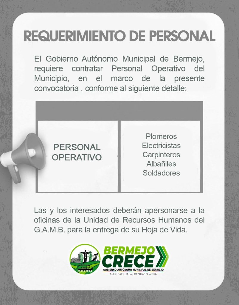 8. El Gobierno Autónomo Municipal de Bermejo informa a la población que requiere personal para cubrir distintos cargos, conforme a los perfiles y requisitos establecidos. Los interesados deberán presentar su Currículum Vitae y documentación correspondiente en las oficinas del Gobierno Municipal, dentro de los plazos que serán oportunamente comunicados. Invitamos a las personas que cumplan con los requisitos, a postular.