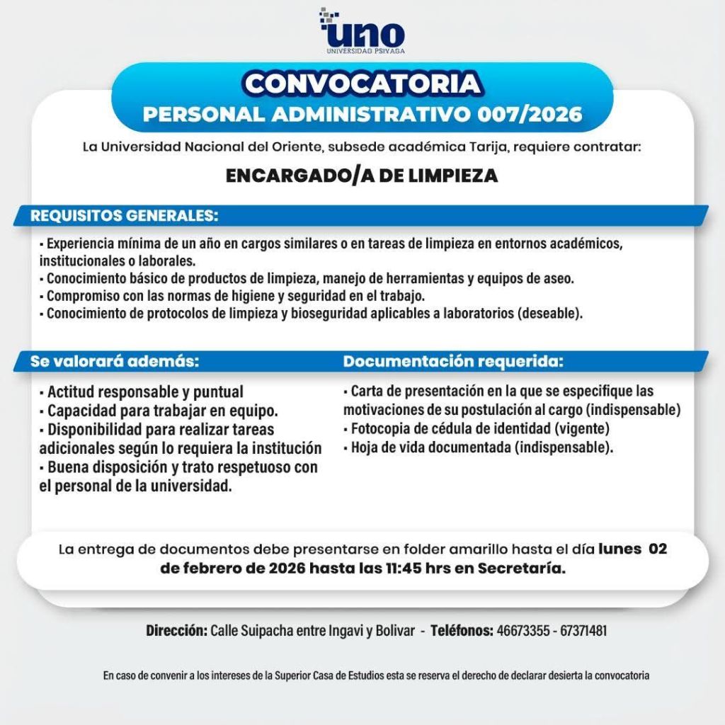 30. La Universidad UNO requiere Encargado/a de Limpieza. Interesados sujetarse a la Convocatoria pública 👇
