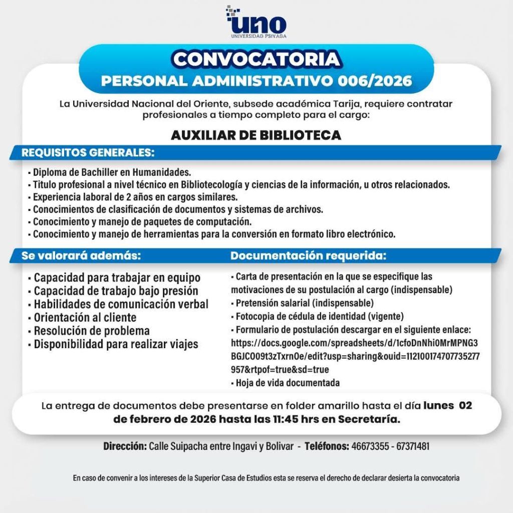 15. La Universidad UNO requiere Auxiliarde Biblioteca. Interesados sujetarse a la Convocatoria pública 👇