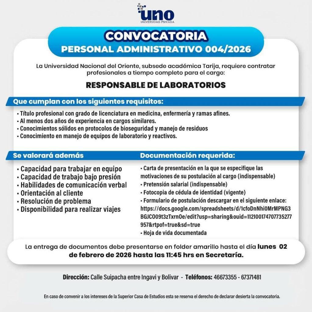 13. La Universidad UNO requiere Responsable de Laboratorios. Interesados sujetarse a la Convocatoria pública 👇
