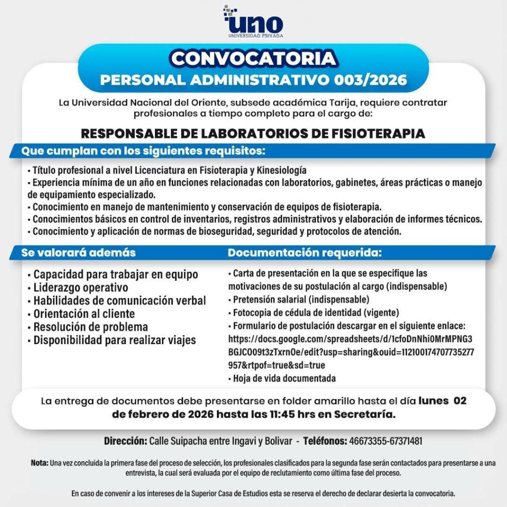 12. La Universidad UNO requiere Responsable de Laboratorios de Fisioterapia. Interesados sujetarse a la Convocatoria pública 👇