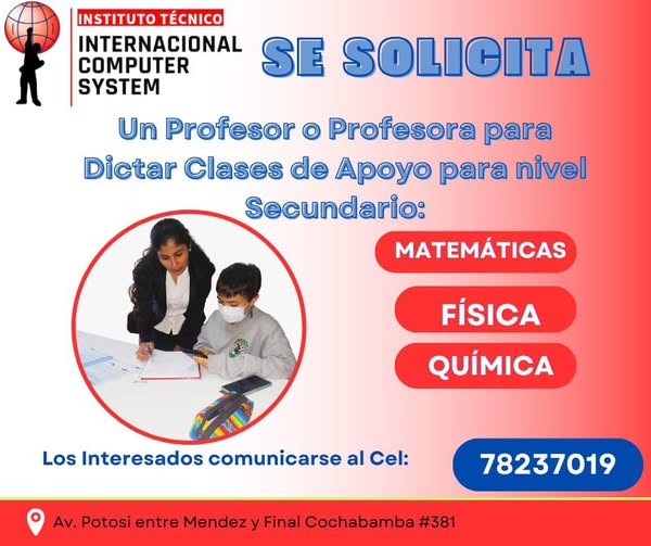 1. ITICS TARIJA requiere Profesor o Profesora para dictar clases del nivel Secundario para las 3 materias esenciales como Matemáticas, Física y Quimica. Interesados comunicarse al 78237019 o dirigirse a la Av. Potosí entre Mendez y Final Cochabamba, frente a Entel.