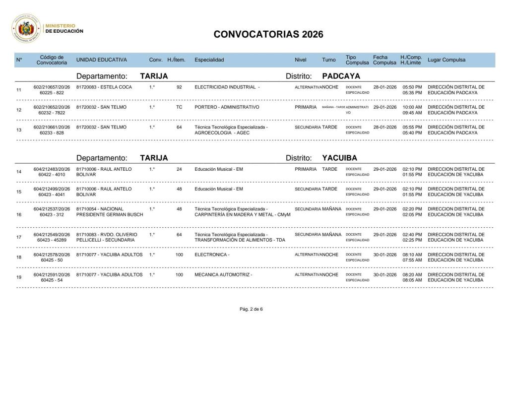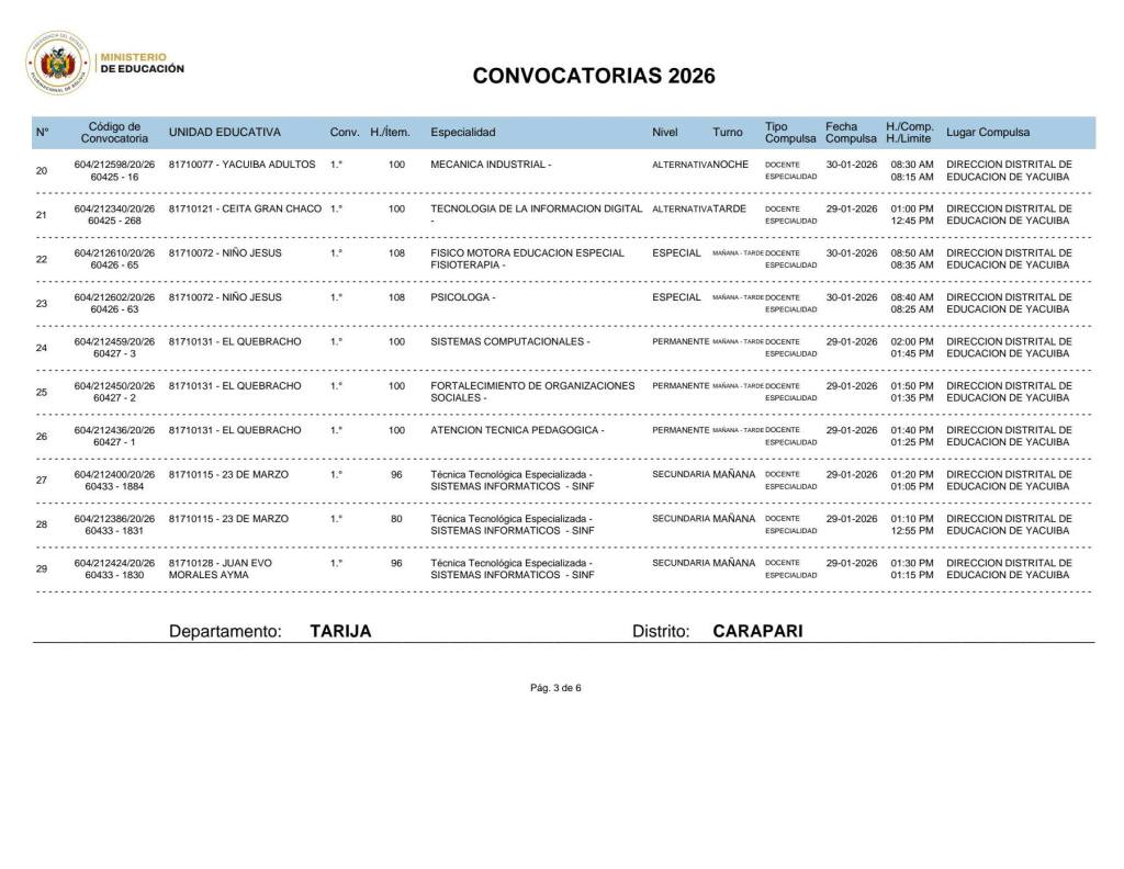 2. La Dirección Departamental de Educación Tarja invita a Maestras, Maestros, profesionales y a toda la comunidad educativa a revisar y postular a las Convocatorias 2026, vigentes en el departamento de Tarija. Interesados en postular, hacer click en el siguiente enlace: