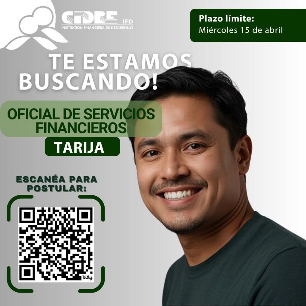 2. CIDRE IFD requiere Oficial de Servicios Financieros para Tarija. Plazo de postulación, miércoles 15 de Abril. Interesados escanear el código QR del gráfico publicitario 👇