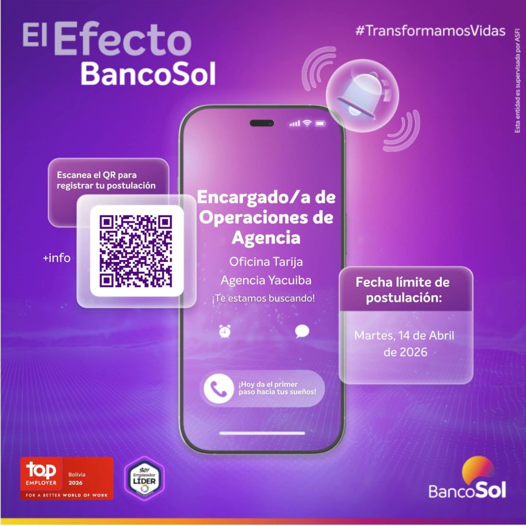 1. BANCO SOL requiere Encargado/a de Operaciones de Agencia para Yacuiba. Plazo de postulación, martes 14 de Abril. Interesados escanear el código QR del gráfico publicitario 👇