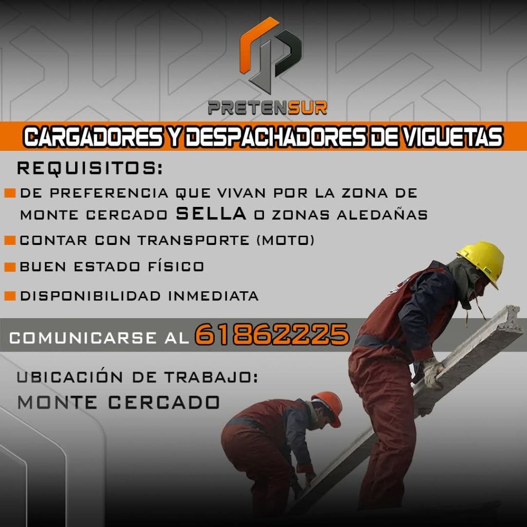 1. PRETENSUR requiere Cargadores y Despachadores de Viguetas, preferentemente domiciliados en Monte Cercado Sella y con transporte propio (moto). Interesados comunicarse al 61862225