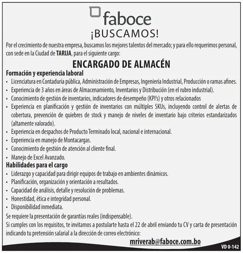 2. FABOCE requiere Encargado de Almacén en Tarija. Plazo de postulación hasta el 22 de Abril. Interesados enviar Curriculum Vitae al Email: mriverab@faboce.com.bo