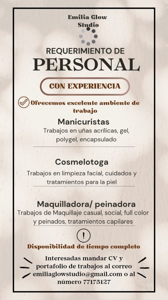 8. Emilia Glow Studio requiere Manicuristas, Cosmetóloga y Maquilladora/Peinadora, con experiencia y disponibilidad de tiempo completo.Interesadas enviar Currículum Vitae y portafolio de trabajos al correo electrónico: emiliaglowstudio@gmail.com o comunicarse al 77175127
