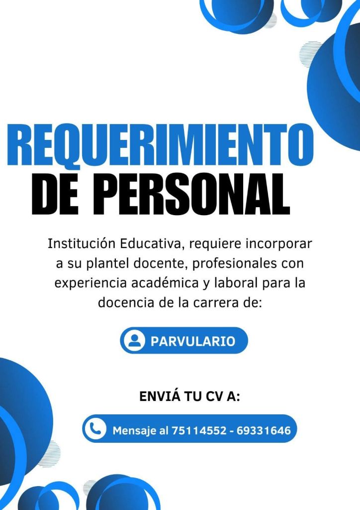 5. IST "Pascal" requiere un Docente Parvulario(a) comprometido, dinámico y con vocación de enseñanza. Interesados enviar Curriculum Vitae al 75114552 - 69331646