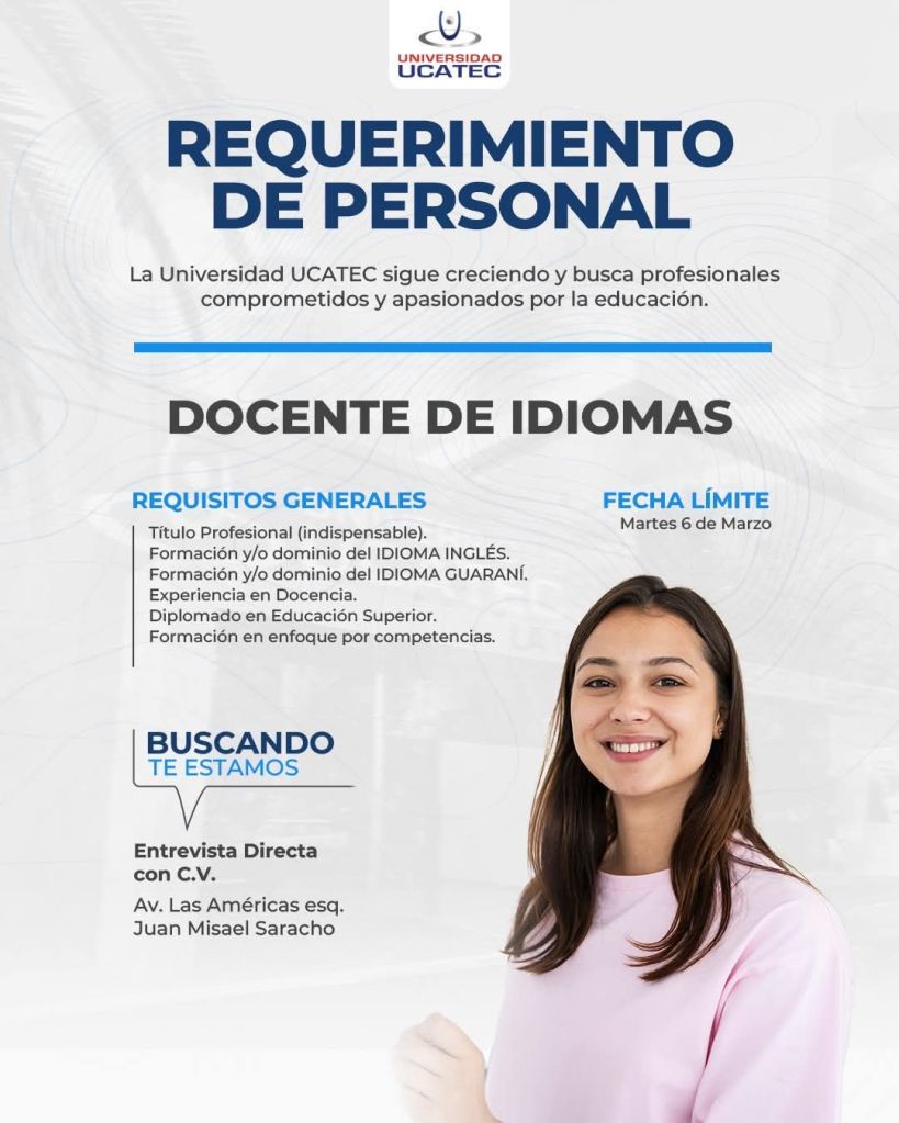 11. ESAM – Escuela de Negocios requiere un/a 𝗔𝗦𝗘𝗦𝗢𝗥(𝗔) 𝗗𝗘 𝗠𝗔𝗥𝗞𝗘𝗧𝗜𝗡𝗚 𝗘𝗗𝗨𝗖𝗔𝗧𝗜𝗩𝗢 para Tarija. Plazo de postulación hasta el 7 de abril. Interesados enviar Currículum Vitae al https://wa.link/4sr8tz o al 68693686