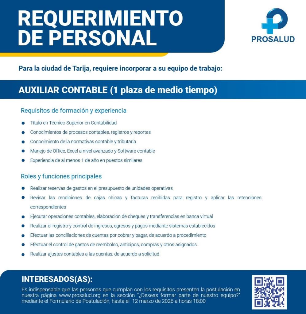 6. PRODEM requiere Asesor de Créditos para Agencias Urbanas de Tarija.Interesados postular mediante el código QR del gráfico 👇