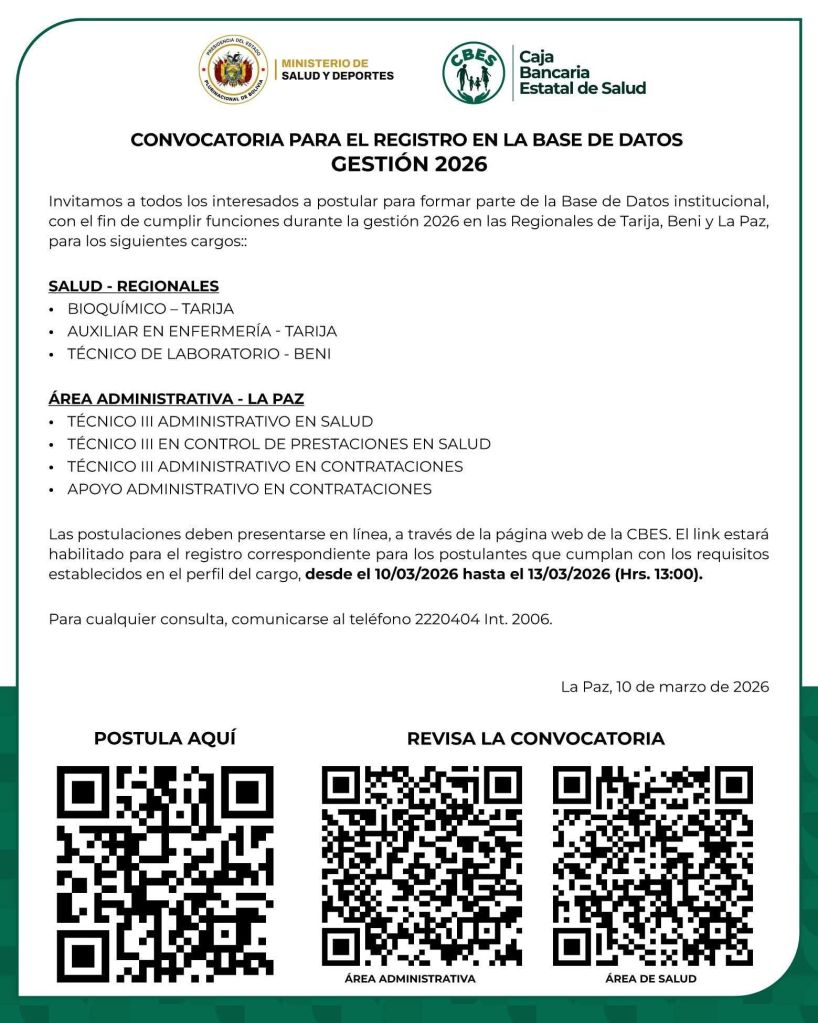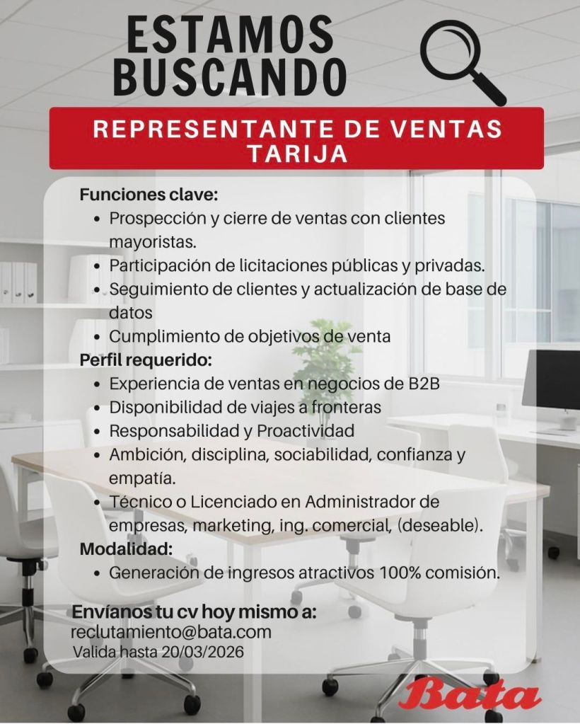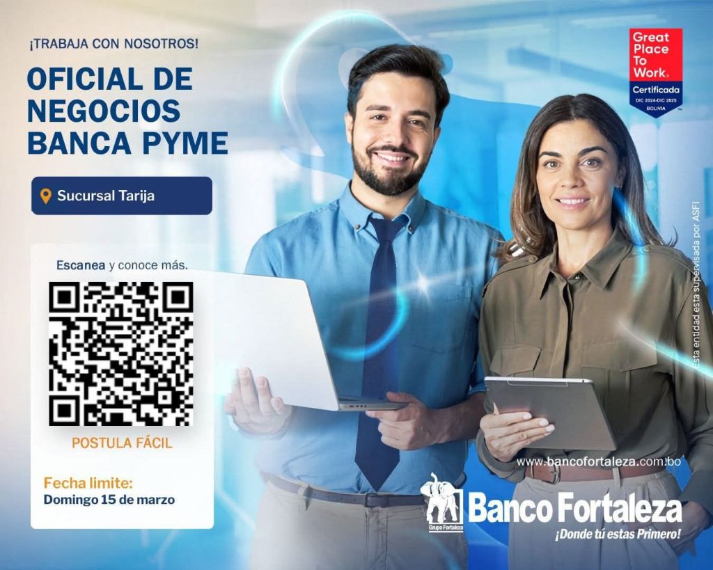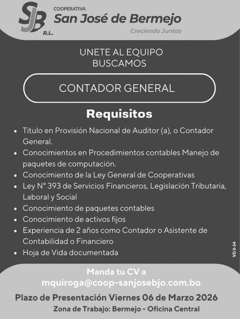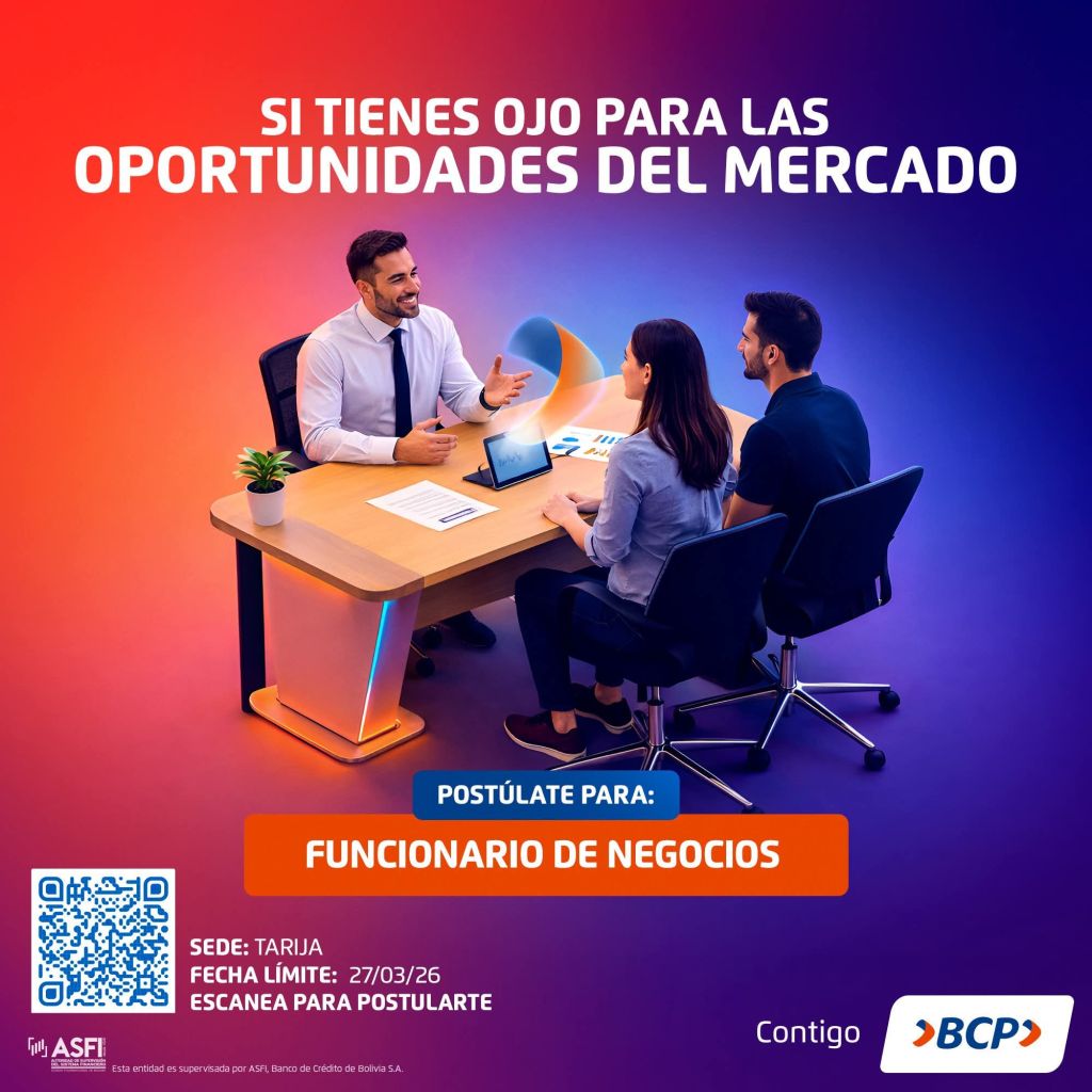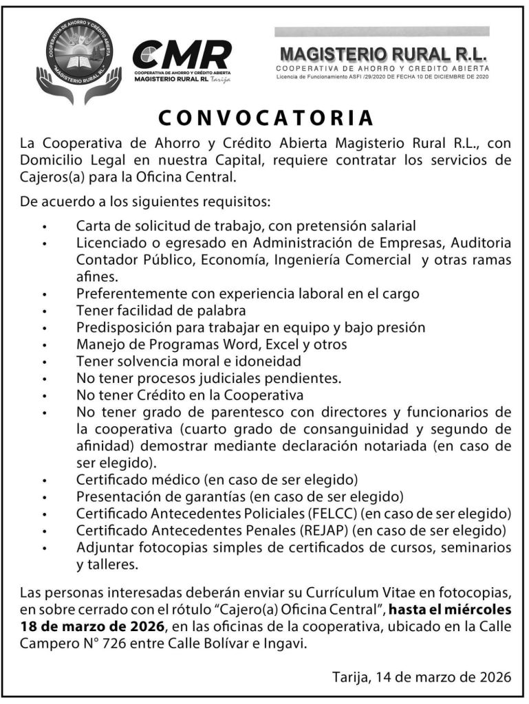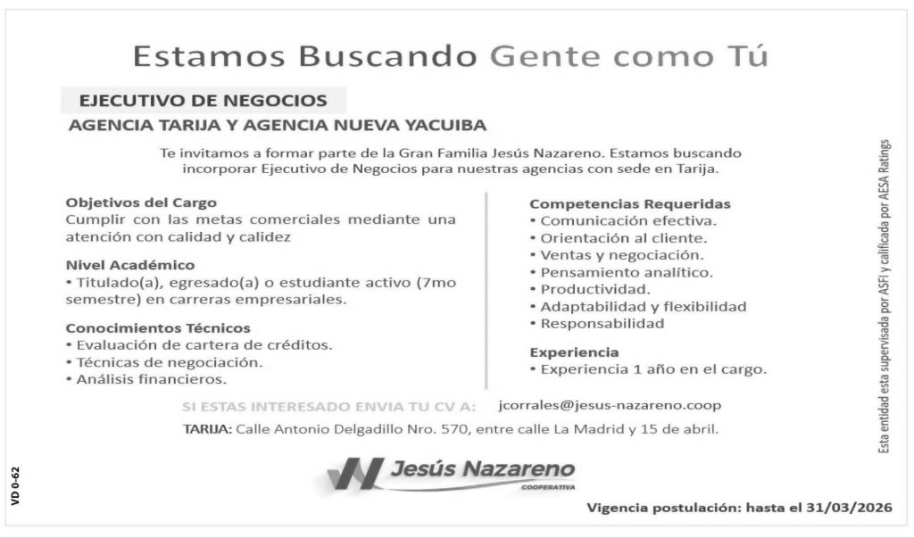 3. Cooperativa Jesús Nazareno requiere Ejecutivo de Negocios para la Agencia Tarija y la nueva Agencia en Yacuiba. Plazo de postulación hasta el 31 de marzo. Interesados enviar su Currículum Vitae al correo electrónico jcorrales@jesus-nazareno.coop