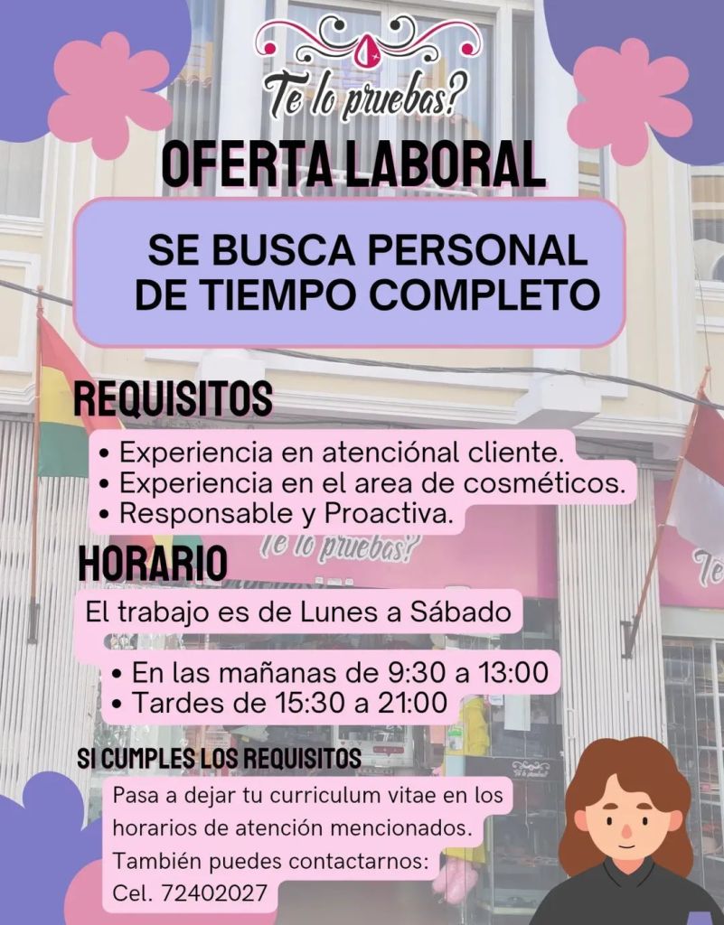 10. TE LO PRUEBAS requiere Personal de tiempo completo, para Atención al Cliente en el área de Cosméticos, de lunes a sábado. Interesados comunicarse y enviar su Currículum Vitae al 72402027
