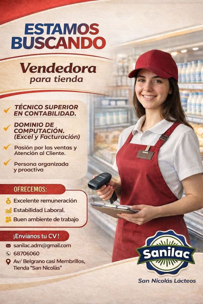 14. SANILAC TARIJA requiere Vendedora para Tienda, que sea Técnico Superior en Contabilidad. Interesadas enviar Currículum Vitae al correo electrónico sanilac.adm@gmail.com o al 68706060