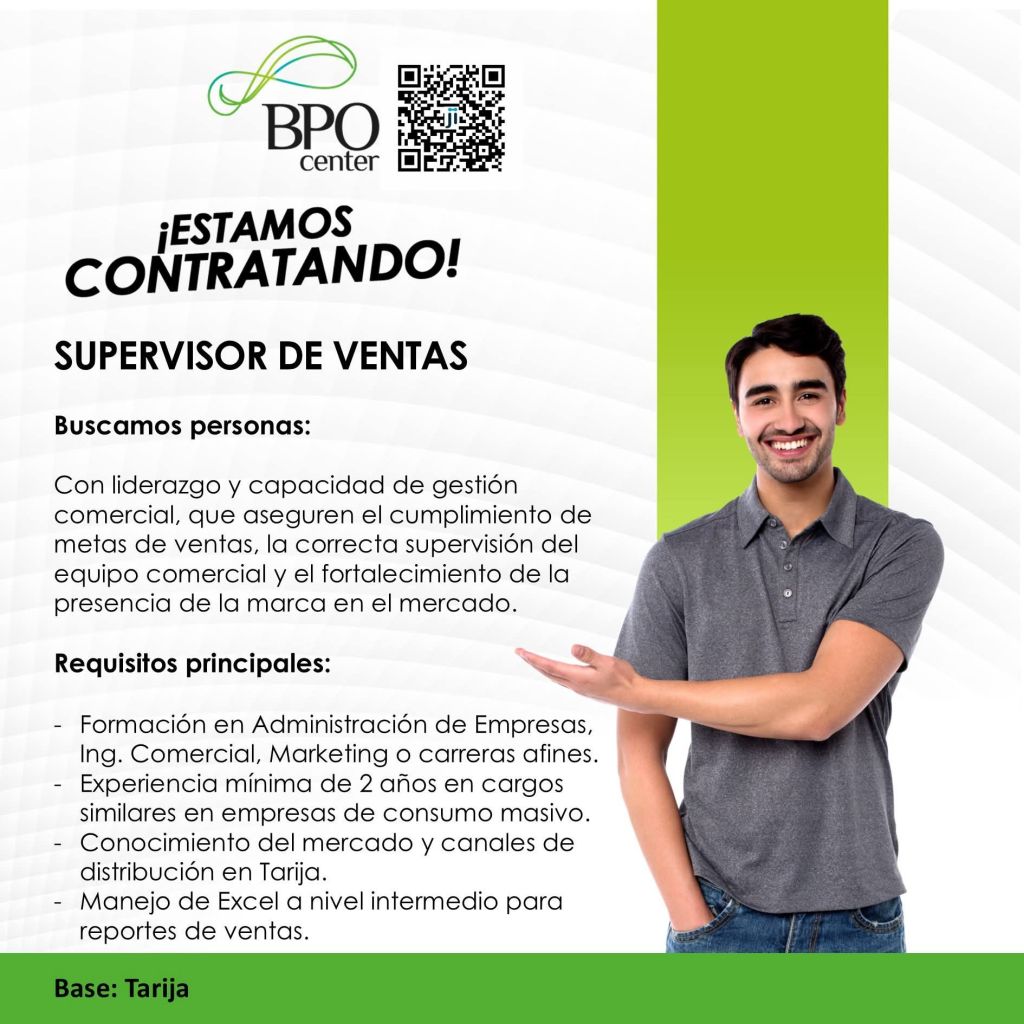 15. BPO CENTER requiere Supervisor de Ventas, con formación académica en Administración de Empresas, Ingeniería Comercial, Marketing o Carreras afines. Interesados postular mediante el código QR del gráfico 👇