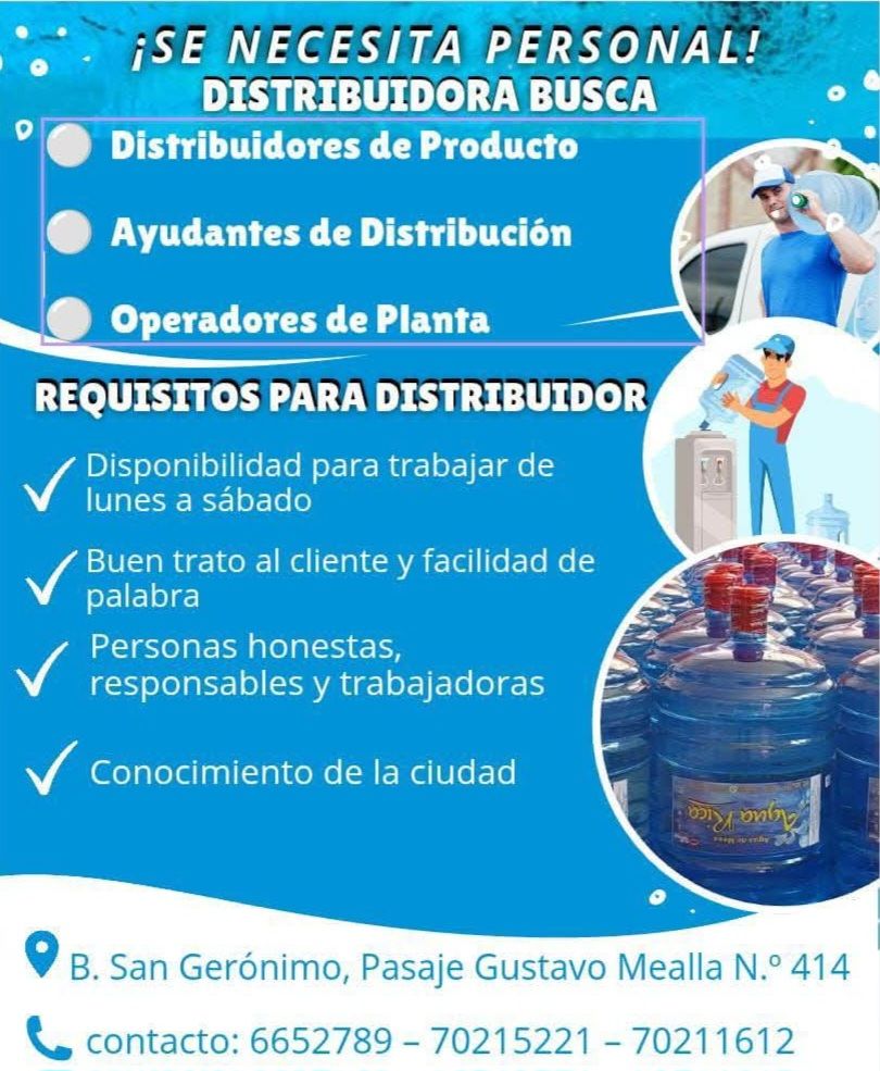 2. Distribuidora del Barrio San Gerónimo requiere en Tarija, distribuidores, ayudantes y operadores de Planta. Interesados comunicarse al 4-6652789, 70215221, 70211612
