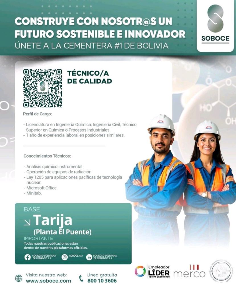 7. FABOCE requiere para #Tarija, un Supervisor de Laboratorio titulado en Ingeniería o Técnico Superior Industrial, Química o ramas afines. Plazo de postulación hasta el 31 de marzo. Interesados enviar Hoja de Vida al correo electrónico: mriverab@faboce.com.bo o dirigirse al Portillo Km.8