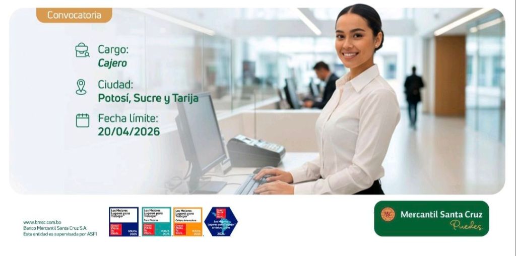 16. BANCO MERCANTIL SANTA CRUZ requiere Cajero. Plazo de postulación hasta el 20 de abril. Interesados postular en el siguiente enlace;