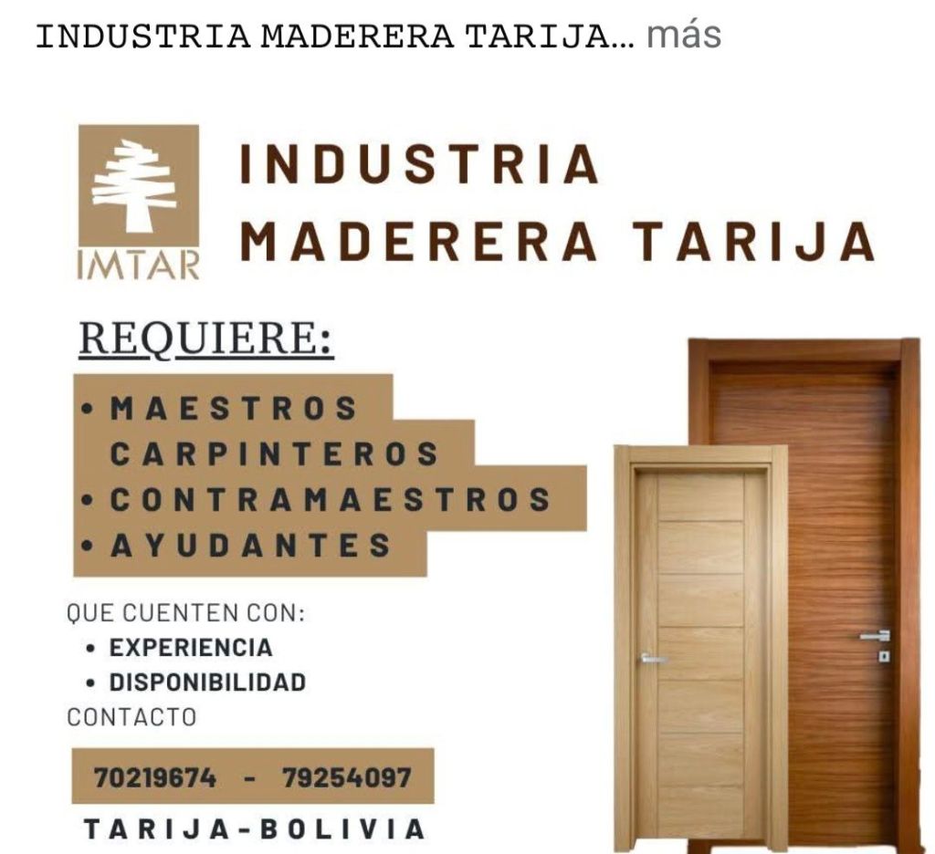 19. Se requiere Maestros Carpinteros con experiencia y Maestros Barnizadores. Interesados comunicarse al 76183859