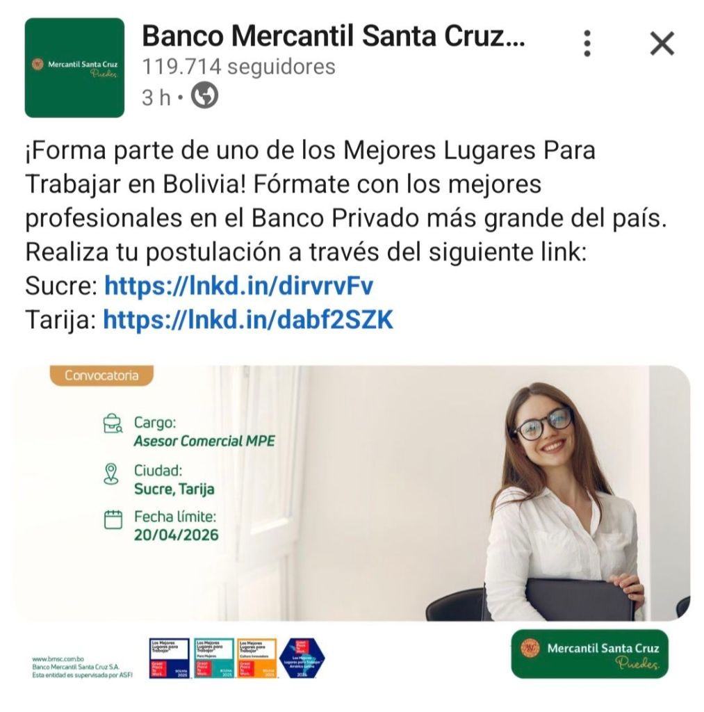 17. BANCO MERCANTIL SANTA CRUZ requiere Asesor Comercial MPE. Plazo de postulación hasta el 20 de abril. Interesados postular en el siguiente enlace;