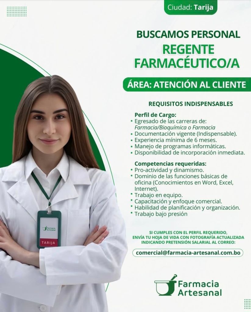 13. Farmacia Artesanal requiere Regente Farmacéutico en Tarija. Un profesional egresado de Farmacia o Bioquímica, con mínimo 6 meses de experiencia. Interesados enviar Curriculum Vitae actualizado, con foto y pretensión salarial al correo electrónico: comercial@farmacia-artesanal.com.bo