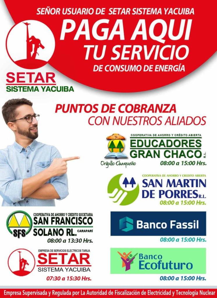 En este sitio, no solo es posible acceder a toda la información de SETAR S.A., sino principalmente, conocer como usuario, cuánto adeuda mensualmente a la Empresa, por su servicio eléctrico. Solo basta con introducir el número de usuario y el número de medidor que señala su Boleta. Válido para usuarios de Yacuiba y Caraparí.