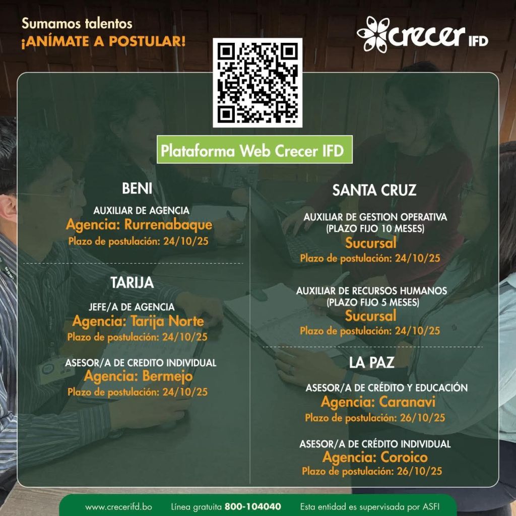 12. #CRECER #IFD requiere Asesor de Crédito y Educación para #Villamontes (Tarija) y para #Yacuiba (#Tarija). Interesados ingresar en el siguiente enlace: https://www.crecerifd.bo/convocatorias/personas