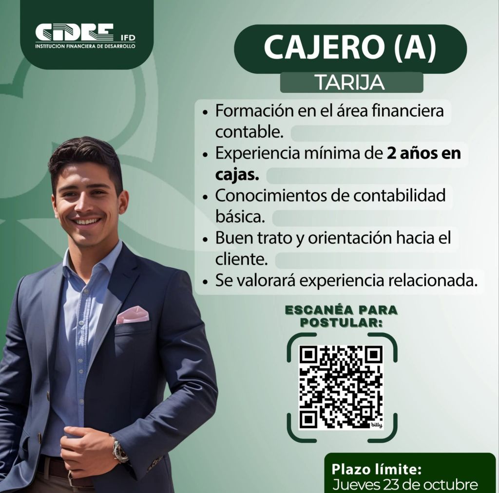 7. BANCO PRODEM requiere Asesor de Créditos para sus Agencias urbanas de Tarija. Interesados postular en el siguiente enlace: https://f.mtr.cool/hcrfjpwydt