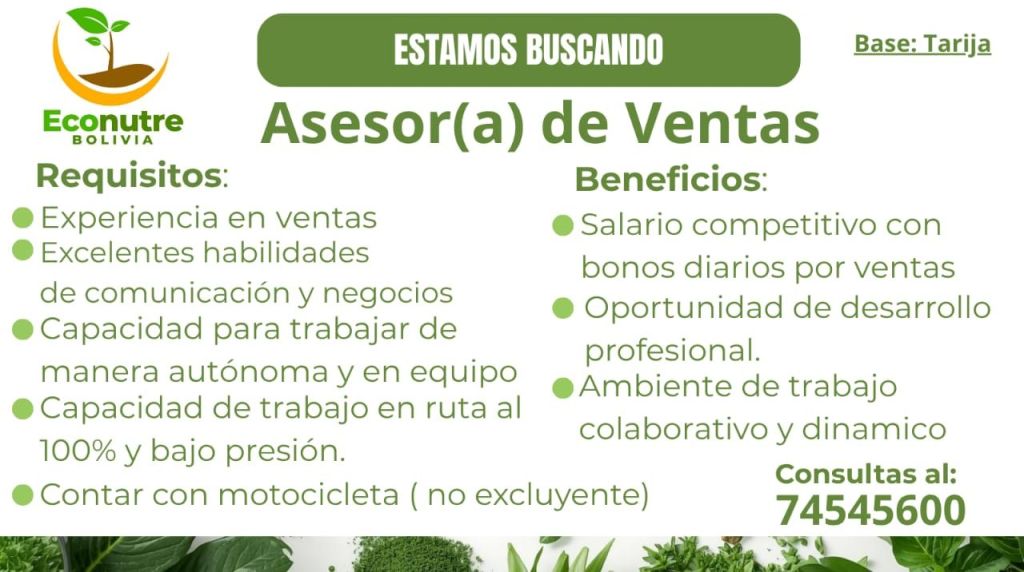 4. #ECONUTRE requiere Asesor de Ventas, con base en #Tarija y experiencia en ventas y atención al cliente. Interesados envíar su 𝗛𝗼𝗷𝗮 𝗱𝗲 𝗩𝗶𝗱𝗮 en formato 𝗣𝗗𝗙, incluyendo el cargo, al 74545600 o llenar el Formulario en el siguiente enlace: https://forms.gle/y58dZ7UAm9feuoZV6